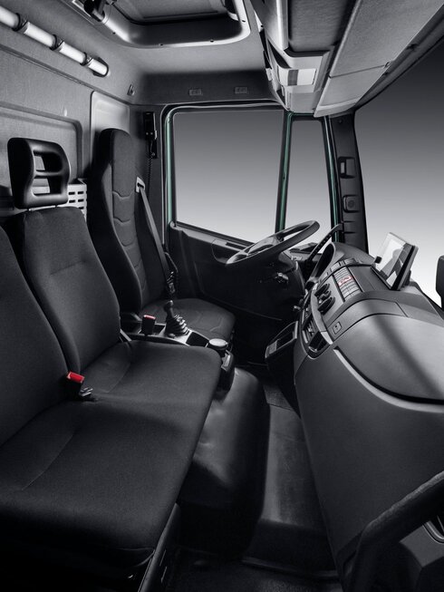 Hochwertig gestaltete Rückwand- und Deckenverkleidungen sorgen für ein angenehmes Ambiente. Auf Wunsch können luftgefederte „High-Comfort“-Fahrersitze verbaut werden. Neben den zahlreichen Verstellmöglichkeiten der Rückenlehne, dem höhenverstellbarem Sicherheitsgurt ist auch eine Sitzheizung/-lüftung integriert. Armlehnen werden bei allen pneumatischen Sitzen optional angeboten.