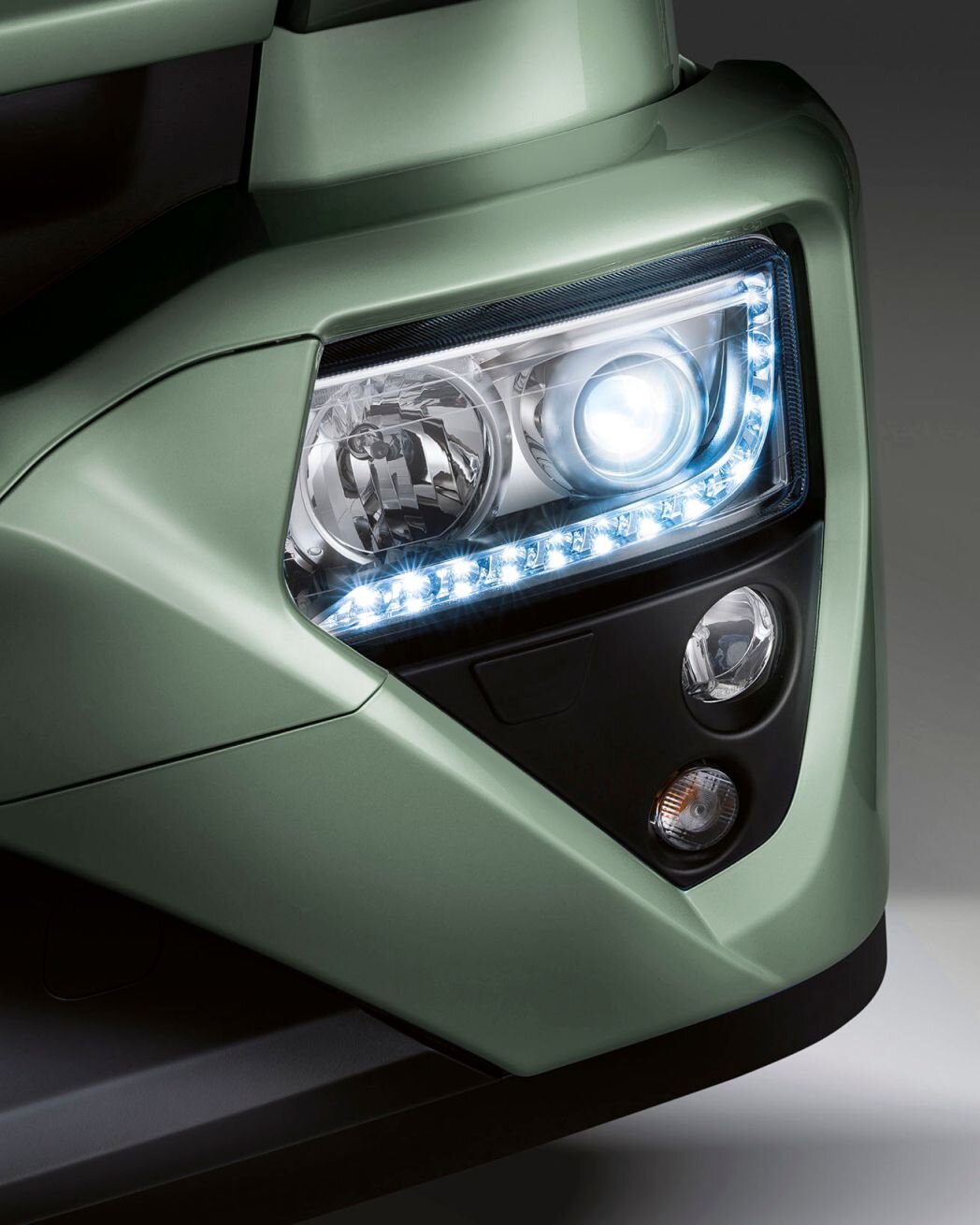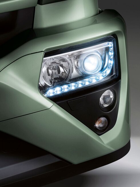 Im Stoßfänger sind die Trittstufen für den Aufstieg zur Kabine und der Radarsensor des fortschrittlichen Fahrerassistenzsystems und des Notbremsassistenten AEBS (Advanced Emergency Braking System) integriert.  Die Scheinwerfer sind serienmäßig mit LED-Tagfahrlicht (DRL) ausgestattet.