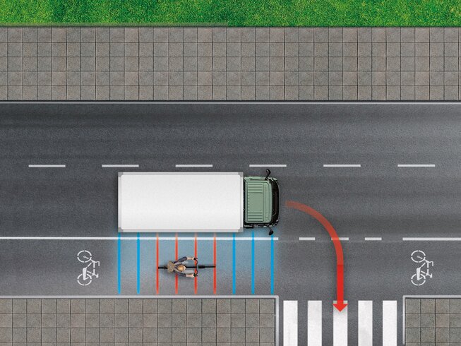 Das System erkennt Fußgänger und Radfahrer im vorderen toten Winkel des Fahrzeugs und warnt den Fahrer vor einer möglichen Kollision.