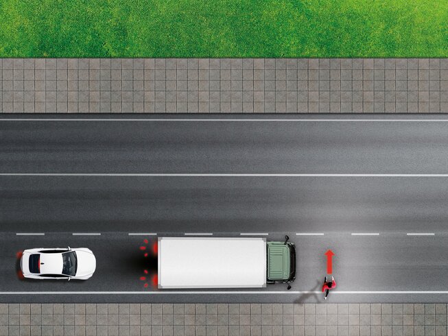 Der Toter-Winkel-Assistent (BSIS) überwacht die Fahrzeugseite und -front und warnt den Fahrer vor gefährdeten Verkehrsteilnehmern in unmittelbarer Nähe. Das System ist optional auch für die Fahrerseite erhältlich.